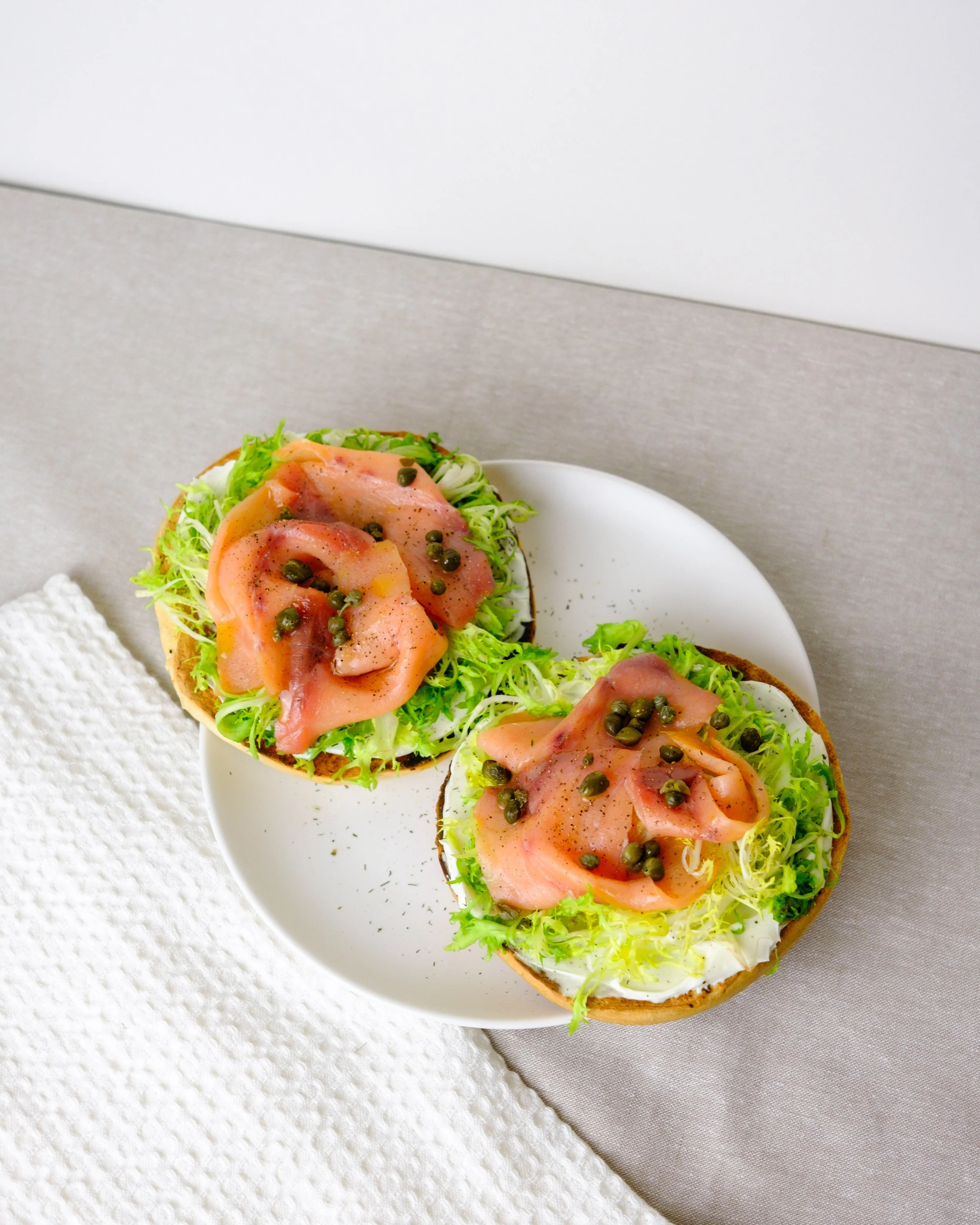 Smoked Atlantic Salmon, whipped cream cheese, frisee, salt & pepper. capers, olive oil, dill.